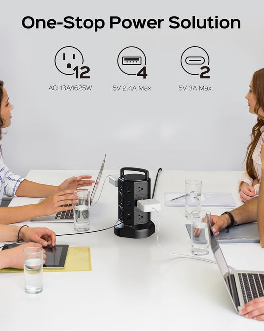 Power Strip Tower Surge Protector, 1625W 13A Outlet Surge Electric Tower, 12 Outlets 6 USB Ports Charging Station with 16AWG 6.5Ft Heavy Duty Extension Cord for Home Office Dorm Black